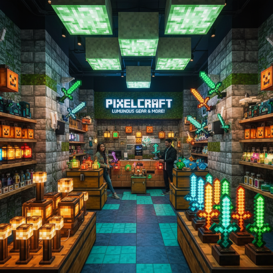 A store 100% inspired by the Minecraft universe, specializing in LED lamps, swords, and luminous torches, with a gamer and decorative touch.